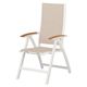 Křeslo vysoké, polohovatelné, sklápěcí, robustní a zároveň lehké díky hliníkové konstrukci bílé barvy, elastická a odolná umělá tkanina v pískové barvě, týkové područky