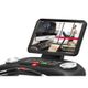 - Další výbava. 2 držáky na láhev s vodou, stojánek na tablet či smartphone, transportní kolečka (vpředu) a mechanismus vyrovnávání nerovností podlahy (vzadu).