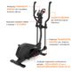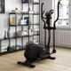 eliptický magnetický trenažér, manuální nastavení zátěže v 8 stupních, držák tabletu, délka kroku 32 cm, šířka nášlapů 23 cm, dlaňové senzory, snadno ovladatelný LCD displej, 12 kg setrvačník, hmotnost 52 kg, nosnost 110 kg