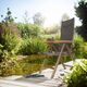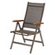 Křeslo sklápěcí, opěradlo polohovatelné do 4 poloh, hliníková konstrukce v bronzovém odstínu, elastická a odolná umělá tkanina v barvě mocca, týkové područky
