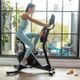 • Vybavení. Komfortní, pěnové sedlo s možností rychlého nastavení výšky i horizontálního posuvu, ergonomická řídítka s nastavitelným sklonem, nastavitelné řemínkové pedály, stojánek na tablet nebo knihu, držák na láhev s vodou, mechanismus vyrovnávání nerovností podlahy (vzadu).