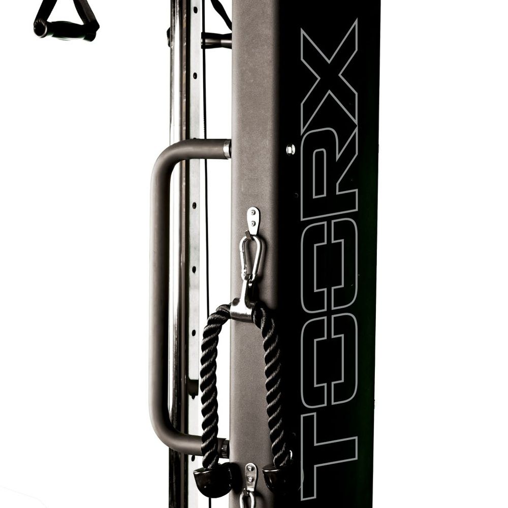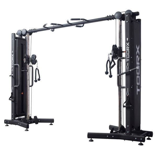 multifunkční posilovací stroj, masivní ocelová konstrukce, výškově nastavitelná kladka, kryté závaží 70 kg, kladka s ložisky, nosnost 150 kg, hmotnost 154 kg