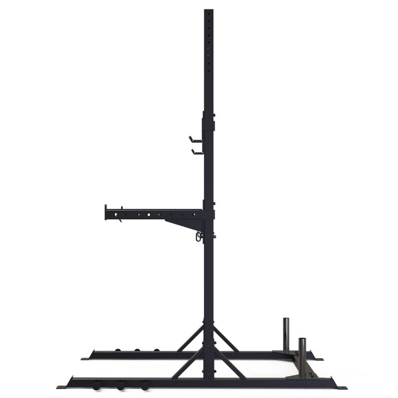 stojan na olympijskou osu, masivní konstrukce, 4 nastavitelné držáky na činku, 2 odkládací trny na kotouče, široká hrazda, 6 držáků na posilovací gumy, max. nosnost 300 kg, hmotnost 85 kg