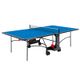 venkovní stůl, sklopitelný, modrá hrací plocha s antireflexním povrchem, 4 zdvojená transportní kolečka, 2 otočná o 360°, síťka součástí stolu, držák na pálky a míčky, bezpečný mechanismus sklopení stolu, hmotnost 58 kg, modrá – černá
